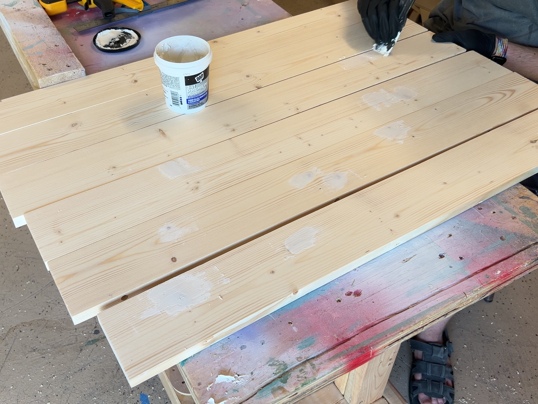 Lay the boards down and start to clamp the boards together. Do this slowly and wipe off the excess glue that squeezes through, immediately, using a damp rag. If your boards start to bow, then using a clamp on each side with some scrap wood to clamp it flat. Let the glue dry overnight.