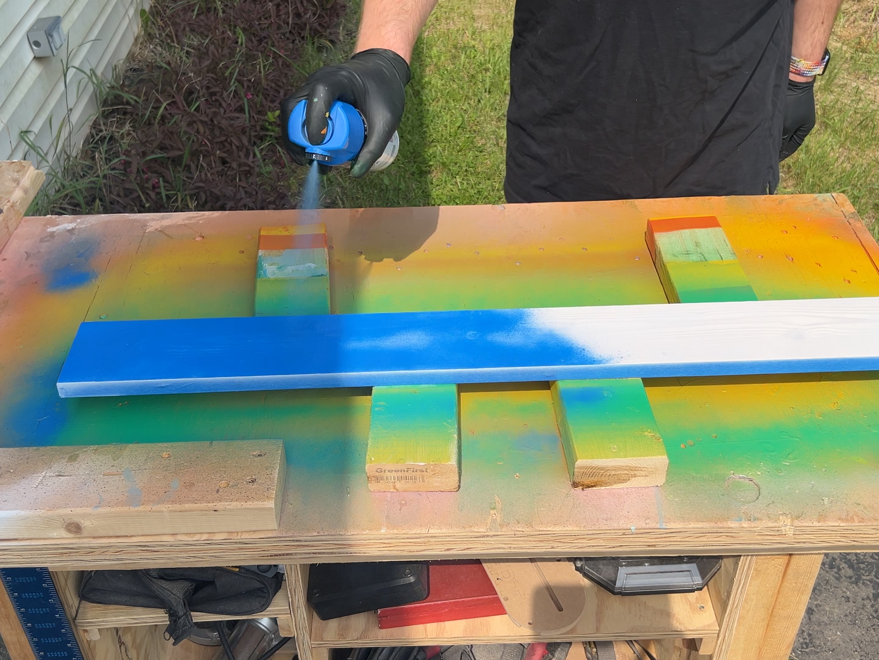 I debated on the approach for painting the flags, but I’m happy with the approach I took. I decided to paint each piece separately before joining so that each board was a separate color. The alternative would be to join the boards and use painters tape to tape off each board. The first step before painting was to use painters tape on the edges that will be joined. We want the wood glue to join the raw wood rather than paint.