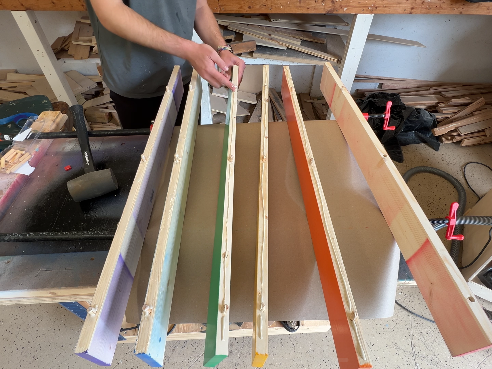 For the pocket hole joinery method for the flags, lay the boards upside down on your pipe clamps and ensure they’re in the correct order. Apply glue on one side of each board. Lay the boards back down and lightly clamp them together. The clamps are just ensuring the boards don’t move while we add the pocket hole screws. Add screws to all the pocket holes, alternating sides being joined.