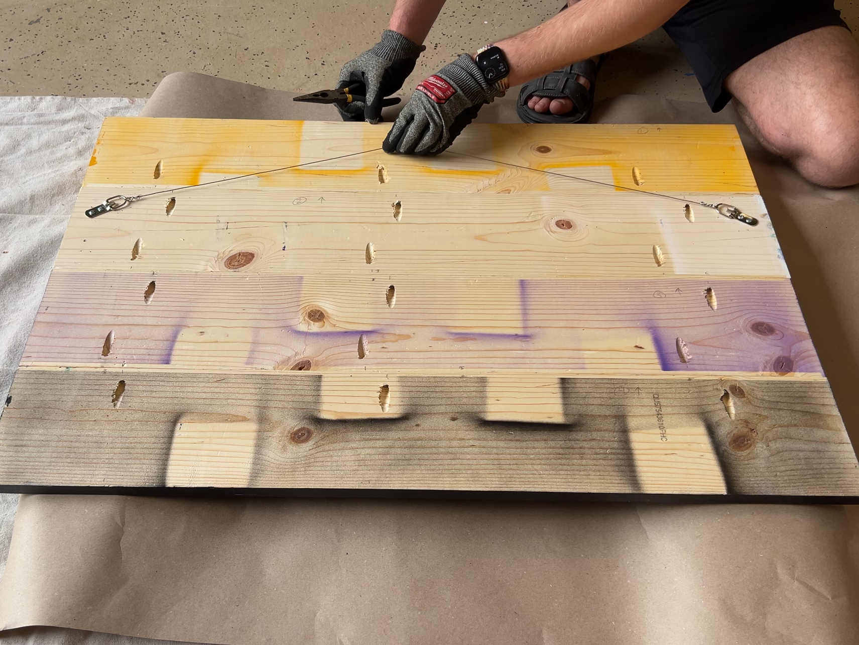 Take your boards one-by-one and ensure the color you’re painting matches the number on the list below. I did three light coats for each color, waiting three minutes between coats. It was super hot when I was painting, so they dried quickly.